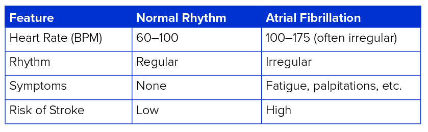 To better understand the impact of atrial fibrillation, the table below compares its effects on heart rate, rhythm, symptoms, and stroke risk with those of a healthy heart.4